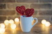 Torba z papierem na stoliku. Kanapa w tle. Walentynkowa torba na przysługi. Czerwone Serce. Koncepcja Walentynek. Makijaż marki Valentine Identity