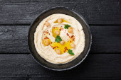 Zdjęcie "Duża miska hummus domowej roboty ozdobiona ciecierzycy, czerwony słodki pieprz, pietruszka i oliwa z oliwek" może być wykorzystywane do celów osobistych i komercyjnych zgodnie z warunkami zakupionej licencji Royalty-free. Obraz jest dostępny do pobrania w jakości wysokiej rozdzielczości do 5760x3840.