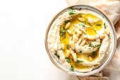 Duża miska hummus domowej roboty ozdobiona ciecierzycy, czerwony słodki pieprz, pietruszka i oliwa z oliwek