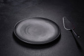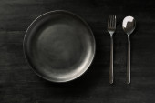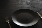 Zestaw zastaw stołowych gotowy do posiłku z czarną przestrzenią do kopiowania