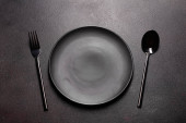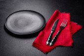 Zdjęcie "Zestaw zastaw stołowych gotowy do posiłku z czarną przestrzenią do kopiowania" może być wykorzystywane do celów osobistych i komercyjnych zgodnie z warunkami zakupionej licencji Royalty-free. Obraz jest dostępny do pobrania w jakości wysokiej rozdzielczości do 5760x3840.