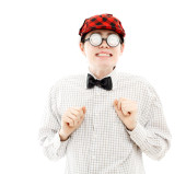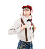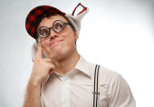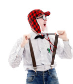Happy mime człowiek z wielobarwnych pierścieni na pomarańczowym tle