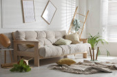 Stylowe poduszki dekoracyjne na beżowej kanapie wewnątrz