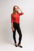Pionowe zdjęcie ładnej uśmiechniętej dziewczyny z długimi włosami i doskonałym makijażem w czerwonej sukience stoi obok ściany w różnych pozach. Uniwersalna koncepcja kobiecego portretu na szarym tle.