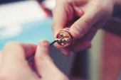 Widok zegarmistrza pracującego z pęsetą i zegarkami na uchwycie