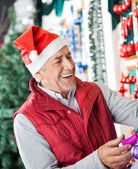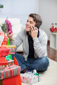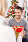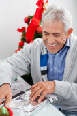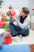 uśmiechnięty mężczyzna patrząc na prezent na Boże Narodzenie