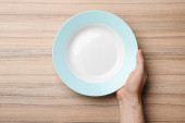 Zdjęcie "Kobieta ręce trzymać płytkę na niebieskim tle, widok z góry" może być wykorzystywane do celów osobistych i komercyjnych zgodnie z warunkami zakupionej licencji Royalty-free. Obraz jest dostępny do pobrania w jakości wysokiej rozdzielczości do 5760x3840.