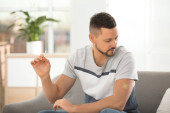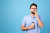 Emocjonalny mężczyzna z plastrem nikotynowym i papierosem w domu