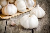 Czosnek na czarnej podłodze cementowej. Widok pod wysokim kątem.