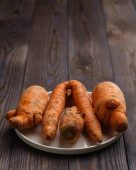 Brzydkie marchewki na białej płaskiej płycie.