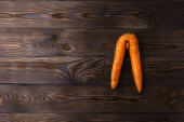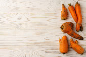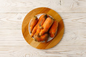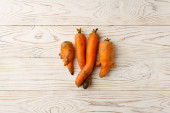 Brzydkie marchewki na białej płaskiej płycie.