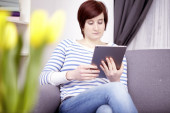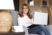 uśmiechnięta młoda kobieta relaksując się przy jej laptop