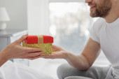 Uśmiechnięty dojrzały mężczyzna daje prezent swojej pięknej żonie w domu