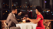 Szczęśliwy afro człowiek w garniturze toasting z jego dziewczyną