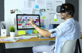 Zdjęcie "Młody programista męski testujący nową aplikację z okularami 3D wirtualnej rzeczywistości w biurze." może być wykorzystywane do celów osobistych i komercyjnych zgodnie z warunkami zakupionej licencji Royalty-free. Obraz jest dostępny do pobrania w jakości wysokiej rozdzielczości do 5760x3840.