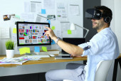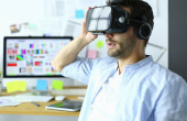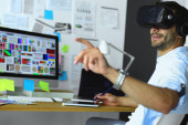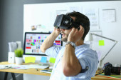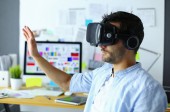 Młody programista męski testujący nową aplikację z okularami 3D wirtualnej rzeczywistości w biurze.