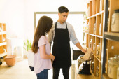 Zdjęcie "Młody mężczyzna właściciel pomaga klientce w zakupach w sklepie spożywczym" może być wykorzystywane do celów osobistych i komercyjnych zgodnie z warunkami zakupionej licencji Royalty-free. Obraz jest dostępny do pobrania w jakości wysokiej rozdzielczości do 5760x3840.