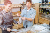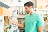 Środkowa część łacińskiego właściciela, pakującego jedzenie do pojemnika w spożywczaku.
