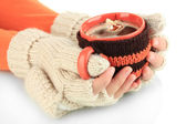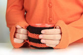 kubek z dzianiny coś na nim w ręce kobiece kobieta na białym tle