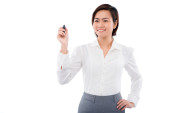 joven empresaria asiática sosteniendo una calculadora y un marcador