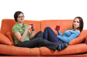 dwie dziewczyny siedzą na kanapie oglądając film