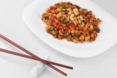 Gotowany ryż z warzywami w misce i sosie na białym tle
