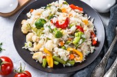 Ryż gotowany z warzywami w patelni na drewnianym stole