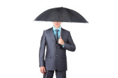 Businessman standing with umbrella.