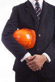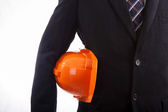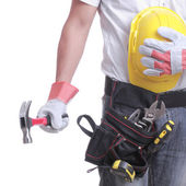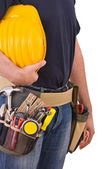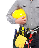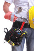 inżynier kobieta trzymając czerwony kask i narzędzia w jej pasa
