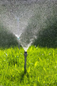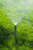 System nawadniania podlewanie zielonej trawy z bokeh tle.