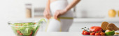Selektywne skupienie się na ekologicznych warzywach z sałatką na stole i sportowcach mierzących biodra z taśmą w kuchni