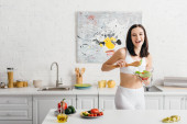 Uśmiechnięta sportowiec gotowanie sałatka z dojrzałych warzyw na stole w kuchni