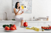 Uśmiechnięta sportowiec trzyma awokado i smartfon w pobliżu warzyw i taśmę pomiarową na stole, dieta kalorii liczenia