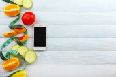 Przycięty widok dziewczyny za pomocą smartfona w pobliżu warzyw, taśma pomiarowa i wagi na stole, dieta kalorii liczenia