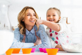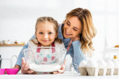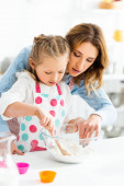 Selektywne skupienie pięknej matki i uroczej córki przesiewania mąki przez sito do miski
