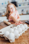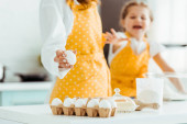Selektywne skupienie ręki dziecka biorąc jajko do ciasta w kuchni