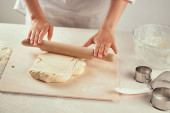 przycięty widok dziecka toczenia ciasta z wałkiem pin