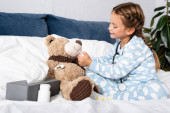 selektywne skupienie się na uśmiechniętej córce pokazując shh i trzymając bukiet w Dniu Matki