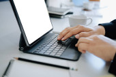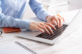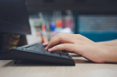 Młody wolny strzelec lub biznesmen pracujący w biurze domowym i maszynie