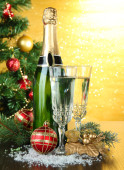 butelkę szampana z okulary i bombki na drewnianym stole na tle choinki
