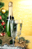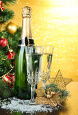 butelkę szampana z kulek szkła i Boże Narodzenie na fioletowym tle
