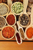 wiele różnych przypraw i pachnące zioła na drewniany stół szczegół
