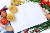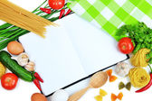 gotowania. Artykuły spożywcze z pustym książki kucharskiej z bliska