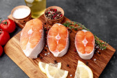 Zdjęcie "Świeże surowe steki łososiowe na kamiennym tle z solą, pieprzem, pomidorami, cytryną" może być wykorzystywane do celów osobistych i komercyjnych zgodnie z warunkami zakupionej licencji Royalty-free. Obraz jest dostępny do pobrania w jakości wysokiej rozdzielczości do 5760x3840.