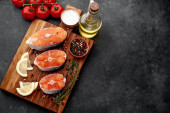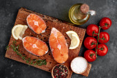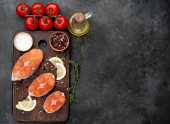Świeże surowe steki łososiowe na kamiennym tle z solą, pieprzem, pomidorami, cytryną