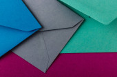 Kolorowe koperty papierowe na jasnym tle. Nowa poczta, napisz wiadomość. Wysyłaj i otrzymuj listy. Poczta. Pusta koperta, puste miejsce. Komunikacja, papierkowa robota. Zbliżenie koperty
