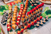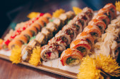 Zdjęcie "Duży zestaw pysznych bułek sushi widok z góry Flat Lay. Wiele asortymentu Philadelphia roll Naczynia z japońskiej surowej ryby w jednym talerzu w tradycyjnej restauracji. Japoński serwis menu żywności" może być wykorzystywane do celów osobistych i komercyjnych zgodnie z warunkami zakupionej licencji Royalty-free. Obraz jest dostępny do pobrania w jakości wysokiej rozdzielczości do 5760x3840.