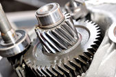 Zbliżenie skrzyni biegów. Metalowe, błyszczące przekładnie do planetarnej zmiany biegów. Przemysłowe narzędzia metalowe do tła