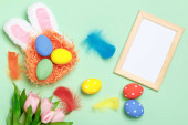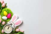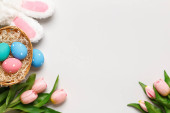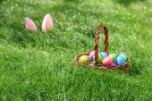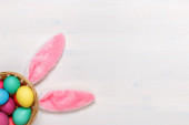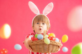 Entuzjastyczne dziecko w uszach króliczka na czerwonym tle. Mała dziewczynka pokazuje palec na koszyku z pisankami