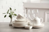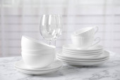 Zestaw czystych zastaw stołowych na jasnoszary marmurowy stół